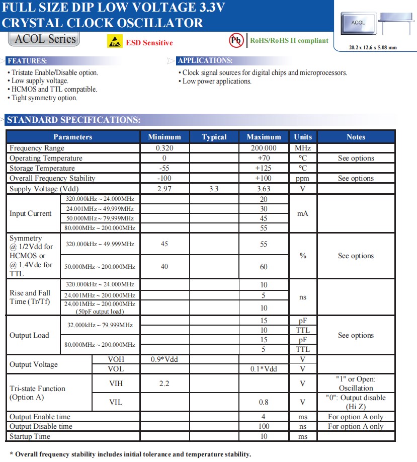 低功耗6G晶振,ACOL-18.432MHZ-EK,Abracon低電壓晶振,美國進口晶振,Abracon艾博康晶振,型號ACOL系列,編碼為:ACOL-18.432MHZ-EK,頻率為:18.432MHz,尺寸為:20.2x12.6x5.08mm,石英晶振,有源晶振,石英晶體振蕩器,無鉛環保晶振,插件晶振,全尺寸降低壓3.3V,晶體時鐘振蕩器,三種狀態的啟用/禁用選項。低電源電壓,HCMOS和TTL兼容。緊密對稱選項。應用于:用于數字芯片和微處理器的時鐘信號源,低功耗應用。