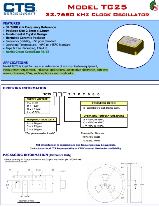 | TC25L5C32K7680 | CTS-Frequency Controls | TC25 | 32.768kHz | ±25ppm | 0.098" L x 0.079" W (2.50mm x 2.00mm) | 0.039" (1.00mm) |