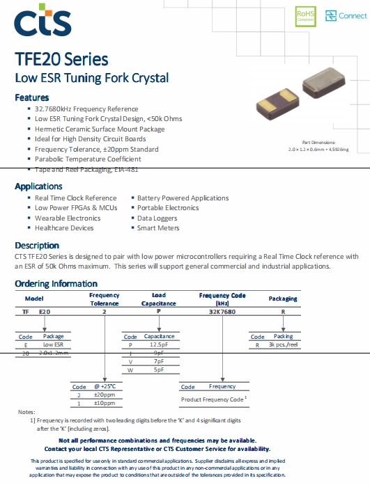 西迪斯晶振TFE20,TFE202W32K7680R水晶振動子,CTS晶振,無源晶體,石英晶體諧振器,SMD晶振,石英晶體,型號TFE20,編碼TFE202W32K7680R是一款金屬面貼片型的石英水晶振子,尺寸為2012mm,頻率32.768KHZ,精度20ppm,負載電容12.5pF,工作溫度-40~+85°C,特點:32.7680kHz頻率參考低ESR調諧叉晶體設計,<50k歐姆密封陶瓷表面安裝包理想的高密度電路板頻率公差,±20ppm標準拋物線溫度系數膠帶和卷軸包裝,EIA-481,應用:實時時鐘參考,低功耗和MCUs,可穿戴電子,醫療設備,電池供電應用,便攜式電子,數據記錄器,智能電表.