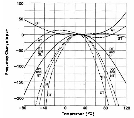 大部份的石英晶體產(chǎn)品是用于電子線路上的參考頻率基準(zhǔn)或頻率控制組件, 所以, 頻率與工作環(huán)境溫度的特性是一個(gè)很重要的參數(shù). 事實(shí)上, 良好的頻率與溫度(frequeny versus temperature)特性也是選用石英做為頻率組件的主要因素之一. 經(jīng)由適當(dāng)?shù)亩x及設(shè)計(jì), 石英晶體組件可以很容易的就滿足到以百萬分之一 (parts per million, ppm) 單位等級(jí)的頻率誤差范圍. 若以離散電路方式將LCR零件組成高頻振蕩線路, 雖然也可以在小量生產(chǎn)規(guī)模達(dá)到所需要的參考頻率信號(hào)誤差在ppm或sub-ppm等級(jí)要求, 可是這種方式無法滿足產(chǎn)業(yè)要達(dá)到的量產(chǎn)規(guī)模. 石英組件的頻率對(duì)溫度特性更是離散振蕩線路無法簡易達(dá)成的. 在(圖四) 中提供了數(shù)種不同的石英晶體切割角度的頻率對(duì)溫度特性曲線.