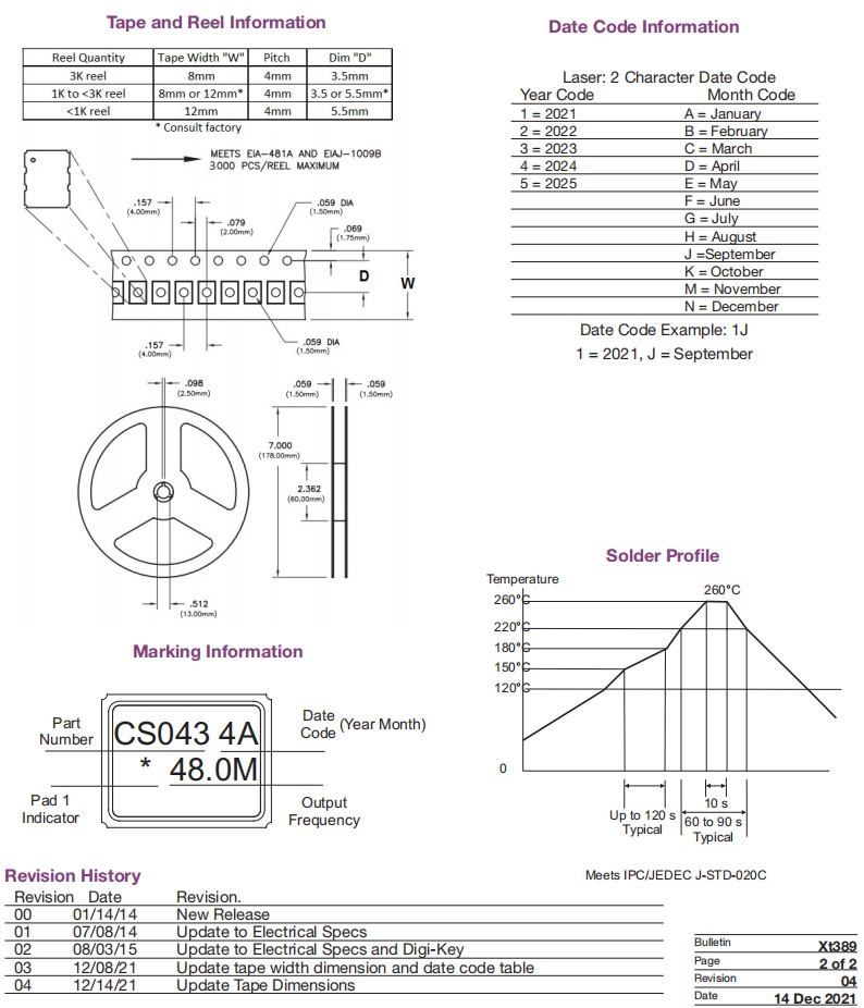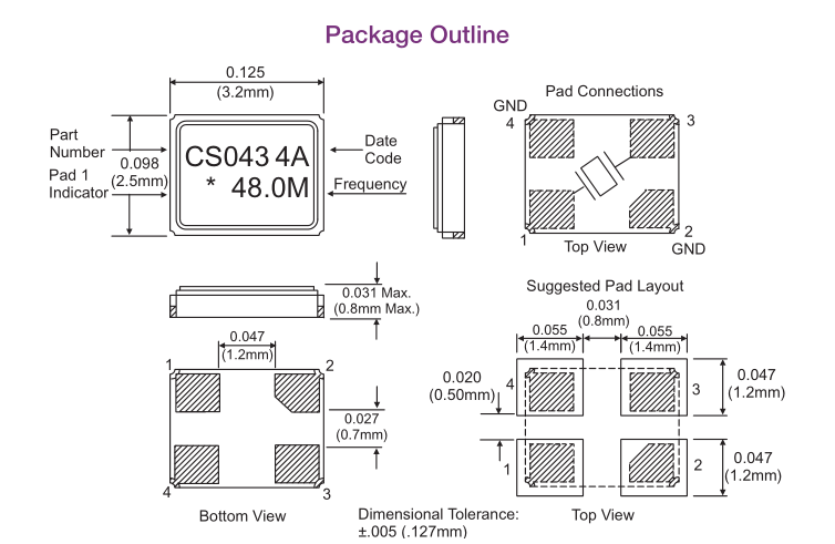 6G合成器應用晶振,CS-043-048.0M,ConnorWinfield晶體諧振器,CS-034-040.0M,四腳貼片晶振,尺寸圖