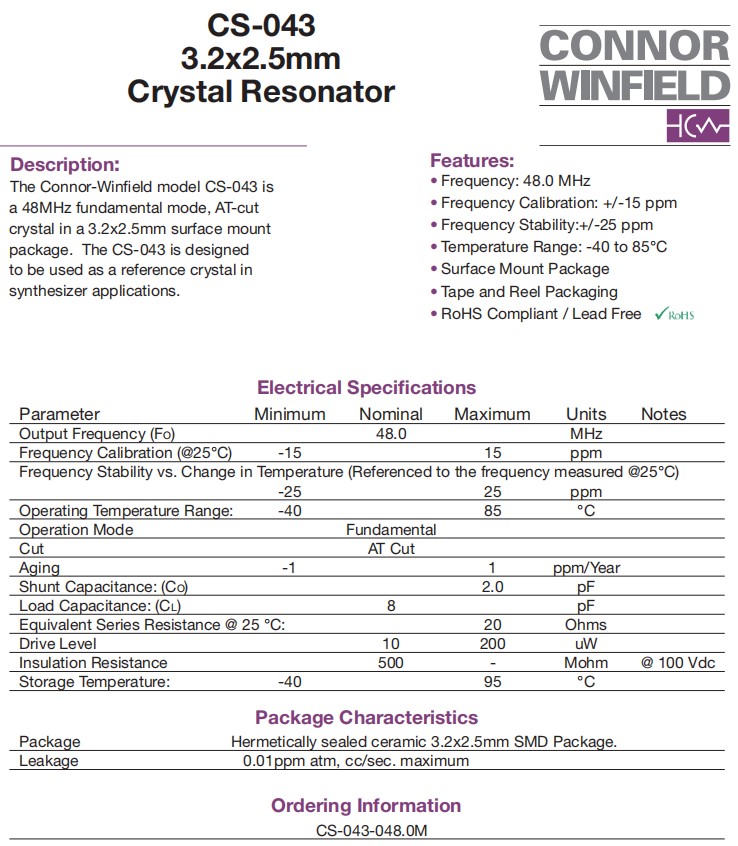 | CS-043-048.0M | ConnorWinfield | CS-043 | MHz Crystal | 48MHz | ±25ppm |