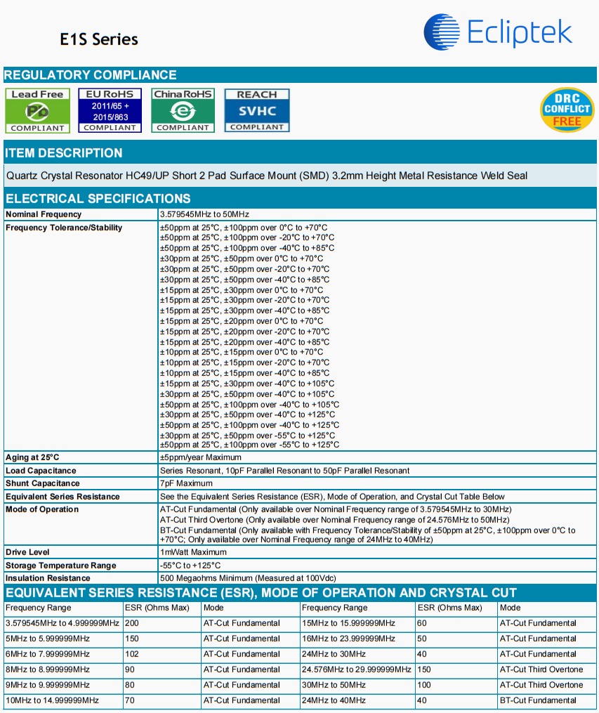 | E1SEA18-4.2944M TR | Ecliptek | E1S | -20°C ~ 70°C | 4.2944 MHz | ±50ppm | ±30ppm | 18 pF |