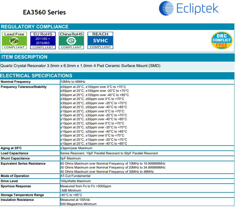 ECLIPTEK晶振公司將有效率的使用自然資源和能源,以便從源頭減少廢物產生和排放.我們將在關注于預防環境和安全事故,保護公眾健康的同時,努力改進我們的操作.我公司將積極參與加強公眾環境、健康和安全意識的活動,提高公眾對普遍的環境、健康和安全問題的注意.ECLIPTEK晶振,EA3560石英晶體諧振器,EA3560NA20-20.000M-TR晶振,