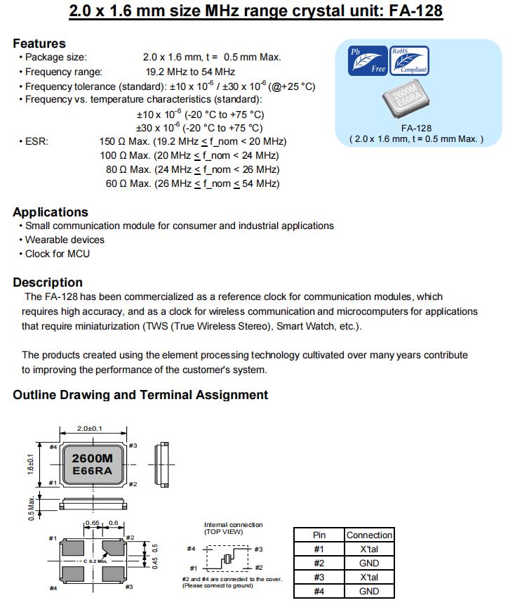 | Q22FA12800226 | 2 x 1.6 x 0.5mm | FA-128 | 26.000000 MHz | 8 pF | +/-10 ppm | -40 to +85 °C |