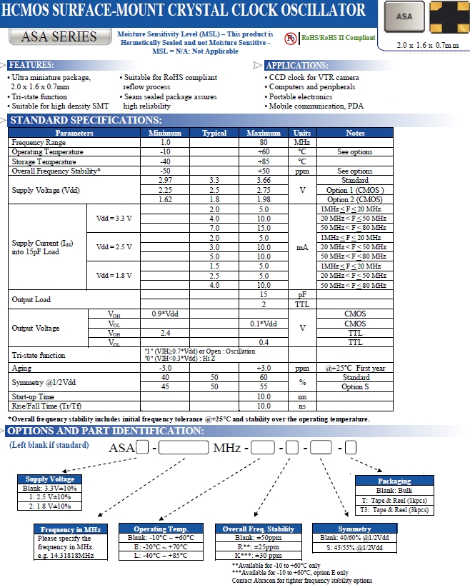 Abracon晶振,ASA-16.000MHZ-L-T振蕩器,ASA石英振蕩器.普通貼片石英晶振外觀使用金屬材料封裝的,具有高穩定性,高可靠性的石英晶體振蕩器,晶振外觀本身使用金屬封裝,充分的密封性能,可確保其高可靠性,采用編帶包裝,外包裝采用朔膠盤,可在自動貼片機上對應自動貼裝等優勢.