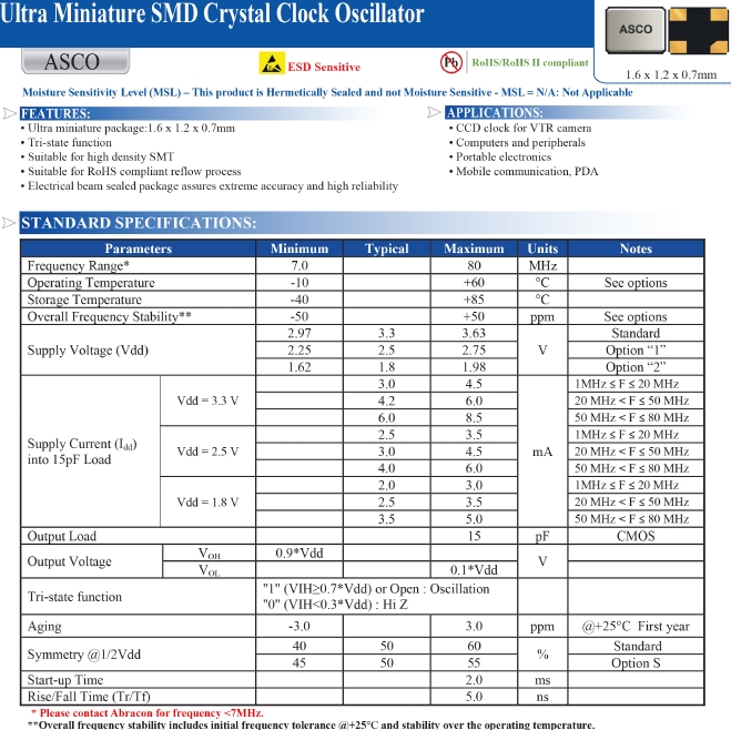 Abracon晶振,ASCO-12.000MHZ-EK-T3貼片晶振,ASCO有源晶振.小型表面貼片晶振型,是常用的石英晶體振蕩器,適用于寬溫范圍的電子數(shù)碼產(chǎn)品,家電電器及MP3,MP4,播放器,單片機等領(lǐng)域.可對應(yīng)8.000MHz以上的頻率,在電子數(shù)碼產(chǎn)品,以及家電相關(guān)電器領(lǐng)域里面發(fā)揮優(yōu)良的電氣特性,滿足無鉛焊接的回流溫度曲線要求.