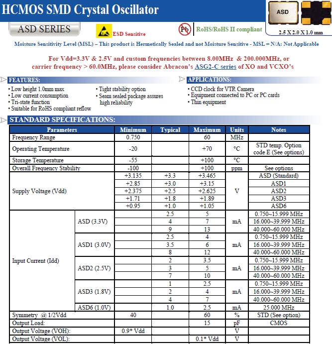 Abracon晶振,ASD3-25.000MHZ-EC-T有源晶體,ASD晶體振蕩器.小體積貼片2520mm晶振,外觀小型,表面貼片型晶體諧振器,因本身體積小等優(yōu)勢,適用于移動通信終端的基準時鐘等移動通信領域.小型,薄型,輕型具備優(yōu)良的耐環(huán)境特性及高耐熱性強.滿足無鉛焊接的回流溫度曲線要求.
