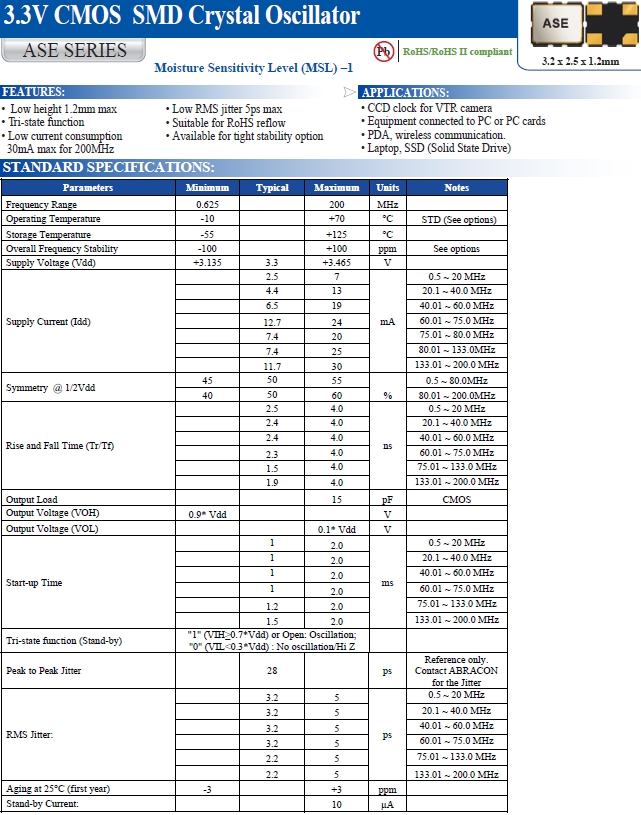 Abracon晶振,ASE-25.000MHZ-LR-T振蕩子,ASE壓電晶振.小型貼片有源晶振,體積的變小也使產(chǎn)品帶來了更高的穩(wěn)定性能,接縫密封石英晶體振蕩器,精度高,覆蓋頻率范圍寬的特點,貼片高速自動安裝和高溫回流焊設(shè)計,Optionable待機輸出三態(tài)輸出功能,電源電壓范圍:1.8V?5V,高穩(wěn)定性,低抖動,低功耗,主要應(yīng)用領(lǐng)域:無線通訊,智能手機,平板筆記本W(wǎng)LAN,藍牙,數(shù)碼相機,DSL和各式IT產(chǎn)品的晶振應(yīng)用,三態(tài)功能,PC和LCDM等數(shù)碼領(lǐng)域,符合RoHS/無鉛.