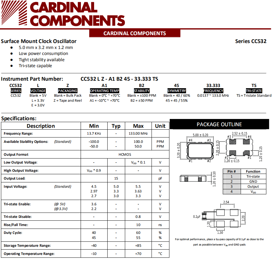 Cardinal晶振,CC532晶振,石英晶體振蕩器.5032mm體積的石英晶體振蕩器有源晶振,改產品可驅動2.5V的溫補晶振,壓控晶振,VC-TCXO晶體振蕩器產品,電源電壓的低電耗型,編帶包裝方式,可對應自動高速貼片機自動焊接,及IR回流焊接(無鉛對應),為無鉛產品,超小型,質地輕.產品被廣泛應用到集成電路,程控交換系統,無線發射基站.