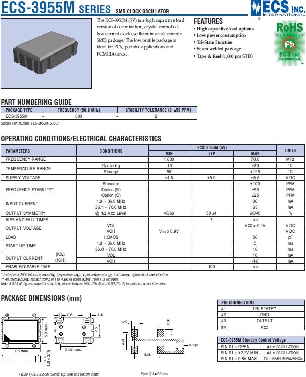 ECS晶體,伊西斯晶振,ECS-3955M石英晶振.有源晶振,是只晶體本身起振需要外部電壓供應(yīng),起振后可直接驅(qū)動CMOS集成電路,產(chǎn)品本身已實現(xiàn)與薄型IC(TSSOP封裝,TVSOP封裝)同樣的1mm厚度,斷開時的消費(fèi)電流是15µA以下,編帶包裝方式可對應(yīng)自動搭載及IR回流焊盤(無鉛對應(yīng))產(chǎn)品有幾種電壓供選1.8V,2.5V,3V3.3V,5V,以應(yīng)對不同IC產(chǎn)品需要.