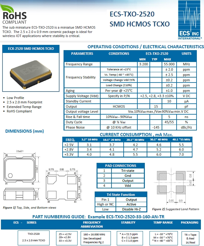 ECS晶體,ECS振蕩器,ECS-TXO-2520貼片晶振.溫補晶振(TCXO)產品本身具有溫度補償作用,高低溫度穩定性:頻率精度高0.5PPM~2.0PPM,常用頻率:26M,33.6M,38.4M,40M.因產品性能穩定,精度高等優勢,被廣泛應用到一些比較品質的數碼通訊產品領域,導航定位系統,智能手機,WiMAX和無線通信等產品,符合RoHS/無鉛.