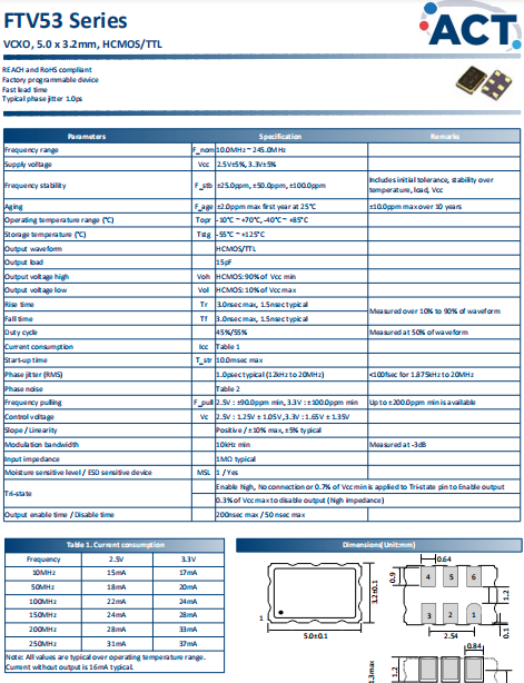 ACT晶振,FTV53晶振,VCXO振蕩器.小型SMD有源晶振,從最初超大體積到現在的7050mm,6035mm,5032mm,3225mm,2520mm體積,有著翻天覆地的改變,體積的變小也使產品帶來了更高的穩定性能,接縫密封石英晶體振蕩器,精度高,覆蓋頻率范圍寬的特點,SMD高速自動安裝和高溫回流焊設計,Optionable待機輸出三態輸出功能,電源電壓范圍:1.8V?5 V,高穩定性,低抖動,低功耗,主要應用領域:無線通訊,高端智能手機,平板筆記本WLAN,藍牙,數碼相機,DSL和其他IT產品的晶振應用,三態功能,PC和LCDM等高端數碼領域,符合RoHS/無鉛.