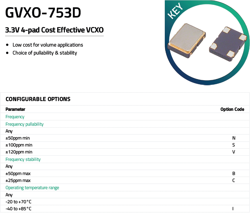 Goliedge晶振,SMD晶振,GVXO-753D石英振蕩器.貼片式石英晶體振蕩器,低電壓啟動功率,并且有多種電壓供選擇,比如有1.8V,2.5V,3.3V,3.8V,5V等,產品被廣泛應用于,平板筆記本,衛(wèi)星系統(tǒng),光纖通道,千兆以太網,串行ATA,串行連接SCSI,PCI-EXPress的SDH / SONET發(fā)射基站等領域.符合RoHS/無鉛.