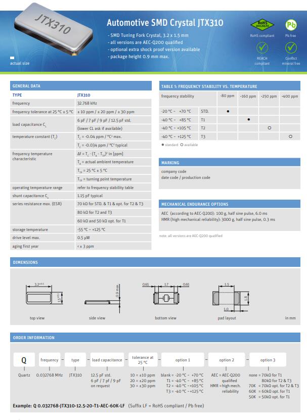 JAUCH晶振,JTX310晶振,進(jìn)口壓電石英晶體.貼片表晶32.768K系列具有超小型,薄型,質(zhì)地輕的表面貼片音叉型石英晶體諧振器,晶振產(chǎn)品本身具備優(yōu)良的耐熱性,耐環(huán)境特性,在辦公自動化,家電領(lǐng)域,移動通信領(lǐng)域可發(fā)揮優(yōu)良的電氣特性,符合無鉛標(biāo)準(zhǔn),滿足無鉛焊接的回流溫度曲線要求,金屬外殼的石英晶振使得產(chǎn)品在封裝時能發(fā)揮比陶瓷晶振外殼更好的耐沖擊性能.