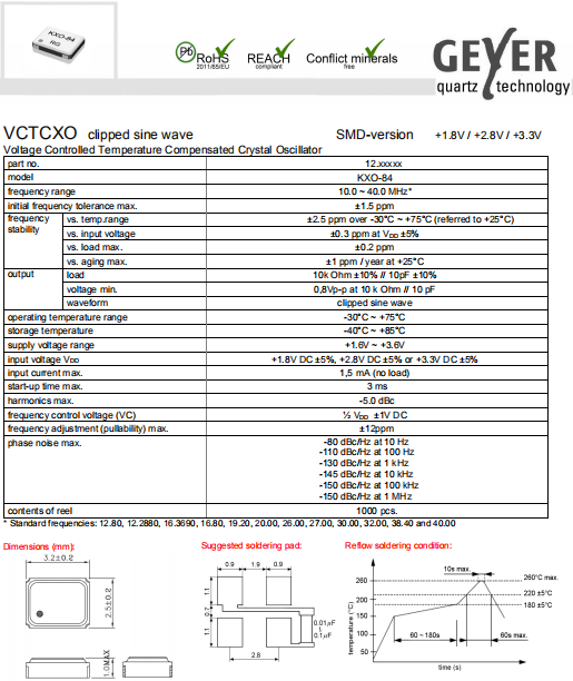 Geyer晶振,KXO-84晶振,VC-TCXO晶振.有源晶振,是只晶體本身起振需要外部電壓供應,起振后可直接驅動CMOS 集成電路,產品本身已實現與薄型IC(TSSOP封裝,TVSOP封裝)同樣的1mm厚度,斷開時的消費電流是15 µA以下,編帶包裝方式可對應自動搭載及IR回流焊接(無鉛對應)產品有幾種電壓供選1.8V,2.5V,3V3.3V,5V,以應對不同IC產品需要.