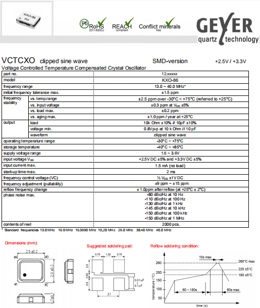 Geyer晶振,KXO-86晶振,壓控溫補晶體振蕩器.2520mm體積的石英晶體振蕩器,有源晶振,該產(chǎn)品可驅(qū)動2.5V的溫補晶振,壓控晶振,VC-TCXO晶體振蕩器產(chǎn)品,電源電壓的低電耗型,編帶包裝方式,可對應(yīng)自動高速貼片機自動焊接,及IR回流焊接(無鉛對應(yīng)),為無鉛產(chǎn)品,超小型,質(zhì)地輕.產(chǎn)品被廣泛應(yīng)用到集成電路,程控交換系統(tǒng),無線發(fā)射基站.