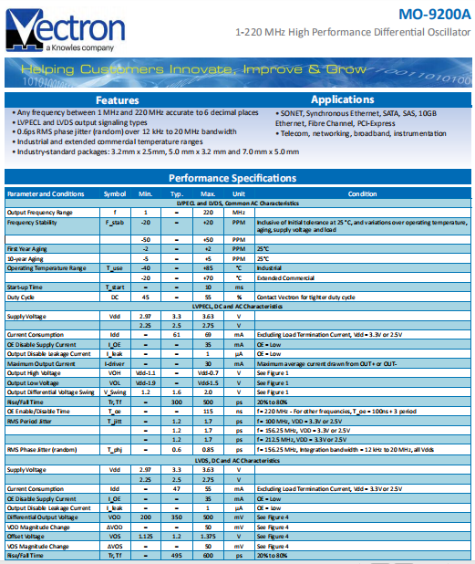 VECTRON晶振,MO-9200A晶振,SPXO有源晶振.貼片式石英晶體振蕩器,低電壓?jiǎn)?dòng)功率,并且有多種電壓供選擇,比如有1.8V,2.5V,3.3V,3.8V,5V等,產(chǎn)品被廣泛應(yīng)用于,平板筆記本,GPS系統(tǒng),光纖通道,千兆以太網(wǎng),串行ATA,串行連接SCSI,PCI-Express的SDH / SONET發(fā)射基站等領(lǐng)域.符合RoHS/無(wú)鉛.
