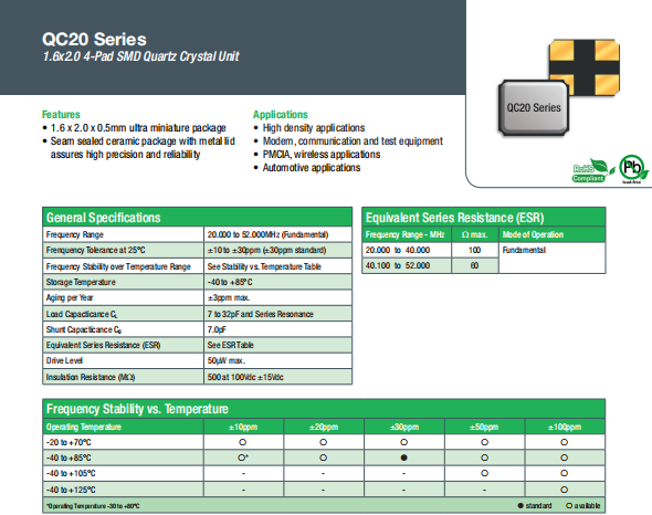 qantek晶振,QC20晶振,貼片無源晶振.貼片晶振本身體積小,超薄型石英晶體諧振器,特別適用于有目前高速發展的高端電子數碼產品,因為晶振本身小型化需求的市場領域,小型,薄型是對應陶瓷諧振器(偏差大)和普通的石英晶體諧振器(偏差小)的中間領域的一種性價比較出色的產品.產品廣泛用于筆記本電腦,無線電話,衛星導航HDD,SSD,USB,Blu-ray等用途,符合無鉛焊接的高溫回流焊曲線特性.