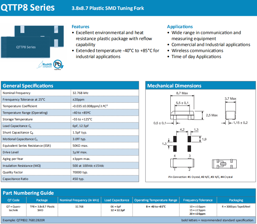 Quarztechnik晶振,QTTP8晶振,水晶振子.小型貼片石英晶振,外觀尺寸具有薄型表面貼片型石英晶體諧振器,特別適用于有小型化要求的市場領(lǐng)域,比如智能手機,無線藍(lán)牙,平板電腦等電子數(shù)碼產(chǎn)品.晶振本身超小型,薄型,重量輕,晶體具有優(yōu)良的耐環(huán)境特性,如耐熱性,耐沖擊性,在辦公自動化,家電相關(guān)電器領(lǐng)域及Bluetooth,WirelessLAN等短距離無線通信領(lǐng)域可發(fā)揮優(yōu)良的電氣特性,滿足無鉛焊接的回流溫度曲線要求.