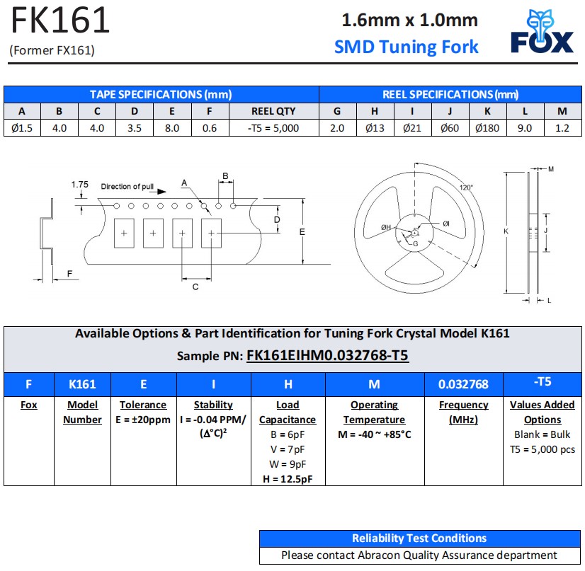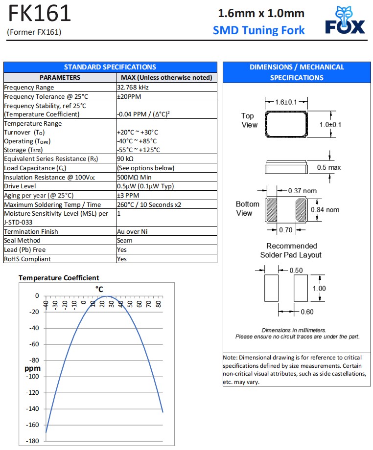 FOX超小型晶振,FK161EIHM0.032768-T5,智能手機(jī)6G晶振,參數(shù)表