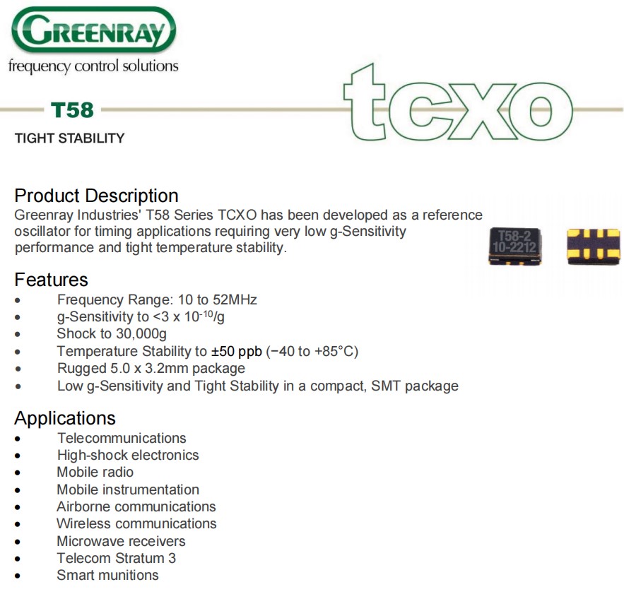 5032mm,T58-J17-CS-LG-45MHz-HG-E,45M,Greenray晶振,T58,低抖動(dòng)晶振,美國(guó)進(jìn)口晶振,Greenray格林雷晶振,型號(hào):T58系列晶振,編碼為:T58-J17-CS-LG-45MHz-HG-E,頻率為:45.000MHz,小體積晶振尺寸為5.0x3.2mm,8墊腳貼片晶振,TCXO晶體振蕩器,貼片溫補(bǔ)晶振,溫補(bǔ)晶體振蕩器,石英晶體振蕩器,有源晶振,具有超小型,輕薄型,低抖動(dòng),低功耗,低電源電壓,低相位噪聲,低電平等特點(diǎn)。T58系列TCXO晶振已被開(kāi)發(fā)為一種參考振蕩器,用于需要非常低的g-靈敏度性能和緊密的溫度穩(wěn)定性。應(yīng)用于:電信,高沖擊電子設(shè)備,移動(dòng)收音機(jī),移動(dòng)儀器,機(jī)載通信,無(wú)線通信,微波接收器,智能彈藥,GPS定位系統(tǒng),導(dǎo)航儀等應(yīng)用。