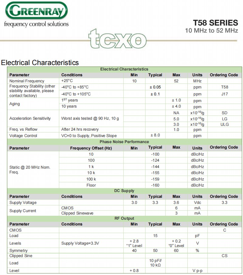 5032mm,T58-J17-CS-LG-45MHz-HG-E,45M,Greenray晶振,T58,低抖動(dòng)晶振,參數(shù)表