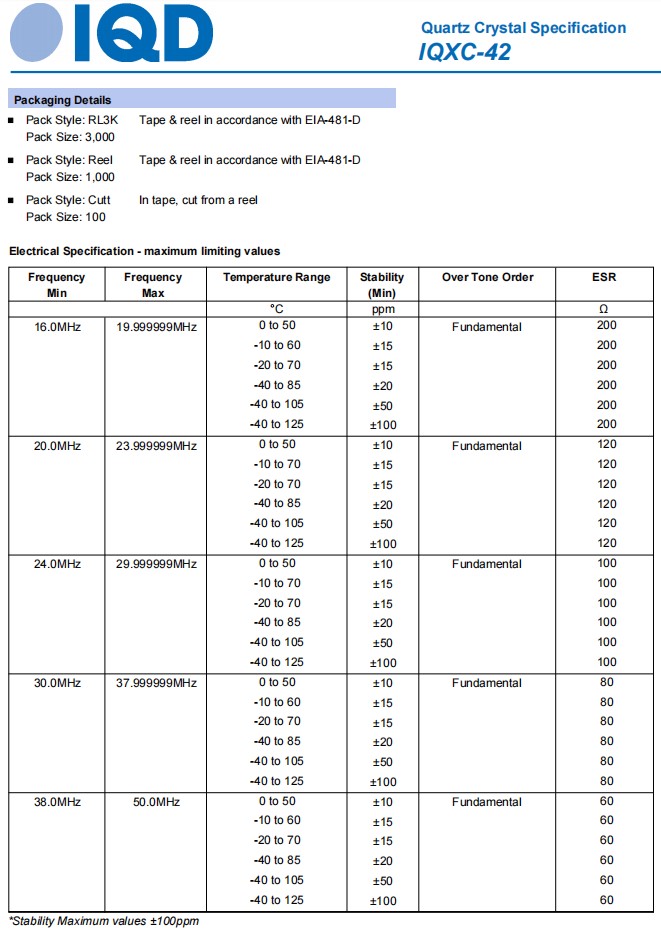 | LFXTAL082131REEL | IQD晶振 | IQXC-42 | CRYSTAL 38.4000MHZ 8PF SMD | 38.4 MHz |