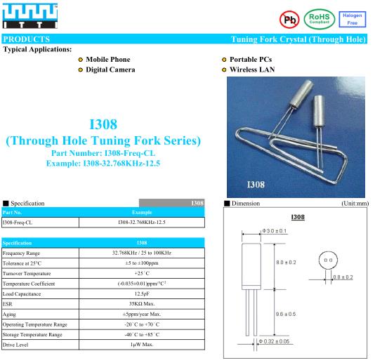 ITTI晶振,I308圓柱插件晶振,I308-32.768KHz-12.5晶振,32.768K圓柱插件晶振最適合用于比較低端的電子產品,比如兒童玩具,普通家用電器,即使在汽車電子領域中也能使產品高可靠性的使用.并且可用于安全控制裝置的CPU時鐘信號發生源部分,好比時鐘單片機上的石英晶振,在極端嚴酷的環境條件下,晶振也能正常工作,具有穩定的起振特性,高耐熱性,耐熱循環性和耐振性等