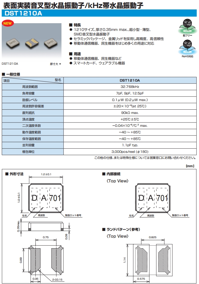 | KDS晶振 | 1TD0701GNS002 | DT-26 | 206 | 32.768KHZ | 7PF | 20PPM | |