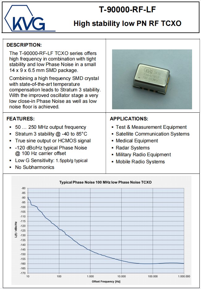 TCXO振蕩器,T-9B4085MXS-LF-125.000MHz,KVG低相位噪聲6G晶振,德國進口晶振,KVG晶振,型號:T-90000-RF-LF,編碼為:T-9B4085MXS-LF-125.000MHz,頻率為:125.000MHz,T-90000-RF-LF TCXO溫補晶體振蕩器系列在一個小型14 x 9 x 6.5 mm石英晶體振蕩器,SMD封裝中提供了高頻結(jié)合緊密穩(wěn)定性和低相位噪聲。將高頻SMD晶體與最先進的溫度補償技術(shù)相結(jié)合,可以獲得第3層的穩(wěn)定性。通過改進的振蕩器級,實現(xiàn)了非常低的近相噪聲和低噪聲地板。層3穩(wěn)定性@-40~85°C,真正弦輸出或HCMOS信號,-120 dBc/Hz典型相位噪聲@ 100 Hz載波偏移,低G靈敏度: 1.5ppb/g典型,無次諧波。T-90000-RF-LF有源晶振應(yīng)用于:測試和測量設(shè)備,衛(wèi)星通信系統(tǒng),醫(yī)療設(shè)備,雷達系統(tǒng),軍用無線電設(shè)備,移動無線電系統(tǒng)。