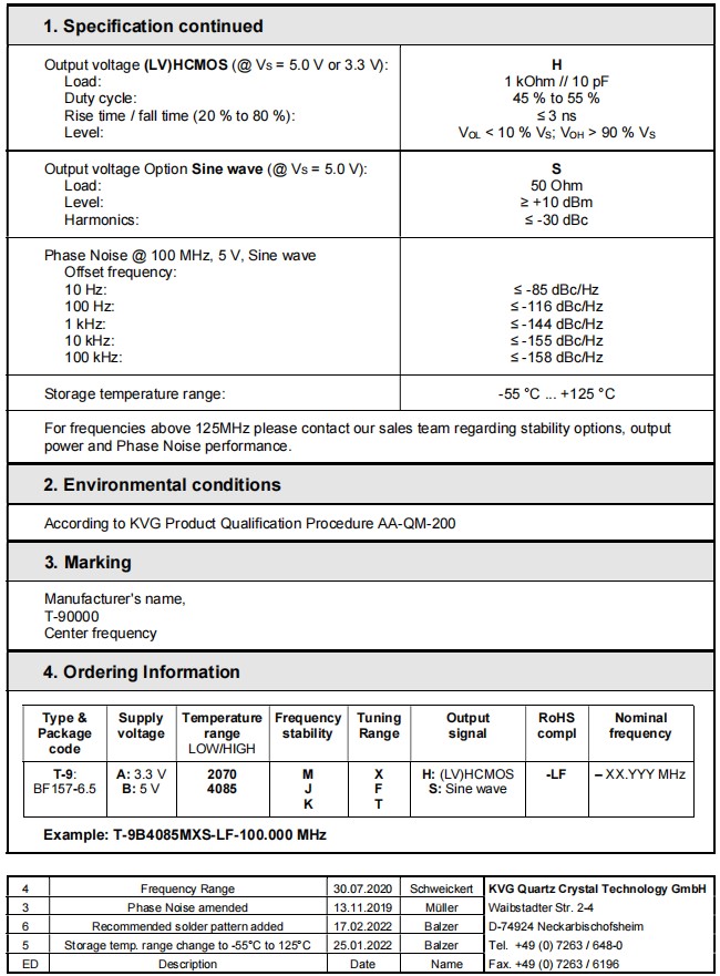TCXO振蕩器,T-9B4085MXS-LF-125.000MHz,KVG低相位噪聲6G晶振,參數(shù)表