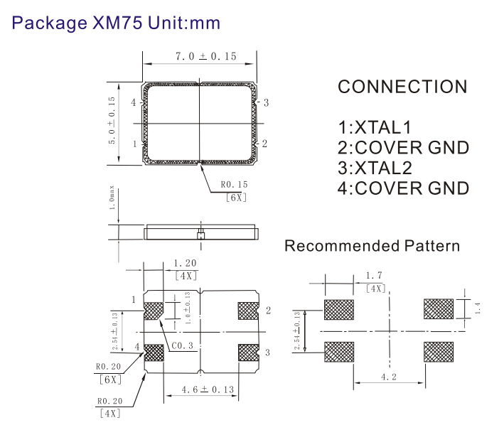 XM75-10P20FC30-XM75-T26M,7050mm,Macrobizes諧振器,26MHz,通訊設備晶振,尺寸圖