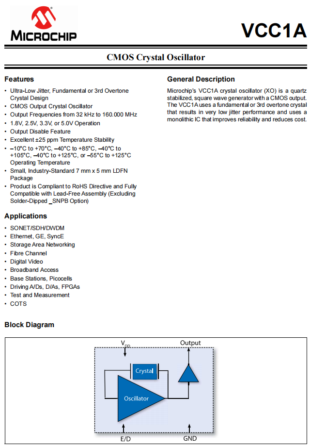 VCC1A-E3R-22M2500000TR,7050mm,22.250MHz,Microchip晶振,VCC1A,寬帶接入應用晶振,參數表
