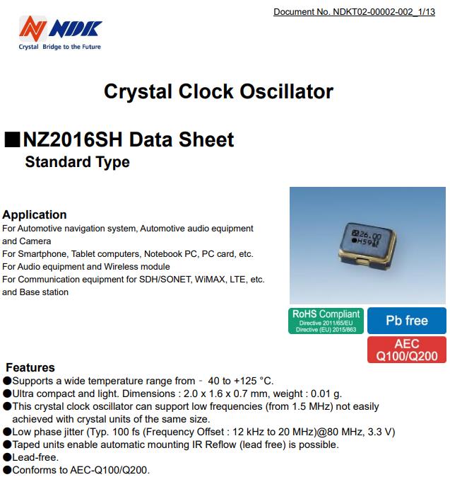 NDK汽車電子專用晶振|NZ2016SH-24.000MHZNSC5022C|2016|1.8V,是一款金屬面貼片型的有源晶振,NDK車規(guī)晶振,汽車電子專用晶振,日本進(jìn)口晶振,石英晶體振蕩器,OSC振蕩器,SMD振蕩器,寬溫晶振,產(chǎn)品特點(diǎn):支持- 40至+125°C的寬溫度范圍。小巧輕便。尺寸2.0x 1.6x 0.7mm,這種晶體時(shí)鐘振蕩器可以支持低頻率(從1.5MHz),用相同尺寸的晶體單元實(shí)現(xiàn)。低相位抖動(dòng)(類型:100fs(頻率偏移:12khz至20mhz)@ 80mhz, 3.3 V),膠帶裝置可自動(dòng)安裝紅外回流管(無(wú)鉛)。應(yīng)用領(lǐng)域:汽車導(dǎo)航系統(tǒng)、汽車音響設(shè)備和攝像機(jī) 智能手機(jī)、平板電腦、筆記本電腦、PC卡等。 音頻設(shè)備和無(wú)線模塊,基站等領(lǐng)域。