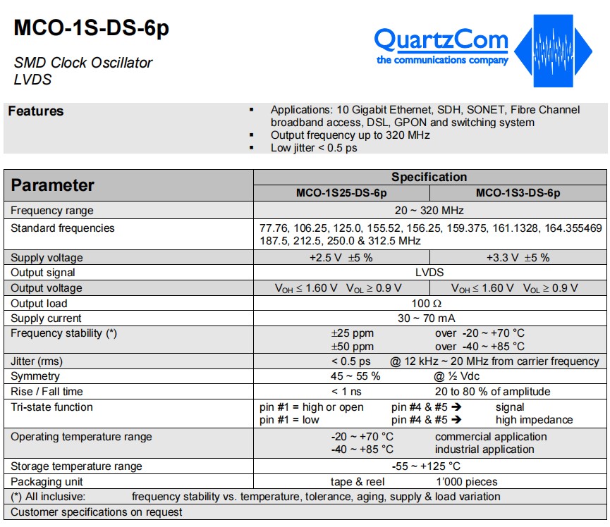 QuartzCom時鐘振蕩器,MCO-1S-DS-6p差分晶振,低抖動6G晶振,有源晶振,LVDS貼片晶振,參數表