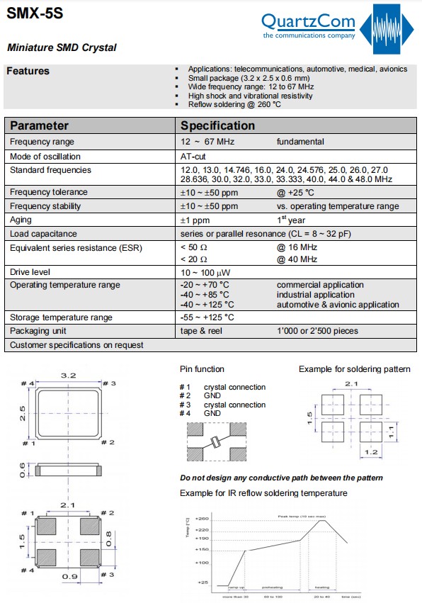 汽車(chē)電子設(shè)備6G晶振,SMX-5S,QuartzCom耐高溫晶振,3225mm石英晶振,輕薄型晶振,瑞士進(jìn)口晶振,QuartzCom石英通晶振,型號(hào):SMX-5S,寬頻率范圍為:12MHz~67MHz,小體積晶振尺寸:3.2x2.5x0.6mm封裝,四腳貼片晶振,無(wú)源晶振,石英晶體諧振器,石英晶振,無(wú)鉛環(huán)保晶振,微型SMD晶體。工作溫度范圍選項(xiàng):-20 ~ +70°C商業(yè)應(yīng)用,-40 ~ +85°C工業(yè)應(yīng)用,-40 ~ +125°C汽車(chē)和航空電子應(yīng)用。3225晶振具有超小型晶振,輕薄型晶振,高沖擊和振動(dòng)電阻率,回流焊@260°C,耐熱及耐環(huán)境特點(diǎn)。應(yīng)用于:電信設(shè)備、醫(yī)療設(shè)備,航空電子設(shè)備,血壓計(jì)晶振,安防設(shè)備,商業(yè),工業(yè)等應(yīng)用。