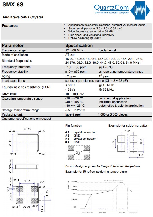 QuartzCom無源晶振,SMX-6S,2520四腳貼片晶振,音頻設備6G晶振,小體積晶振,石英晶體諧振器,瑞士進口晶振,QuartzCom石英通晶振,型號:SMX-6S,寬頻率范圍為:12MHz~66MHz,小體積晶振尺寸:2.5x2.0x0.55mm封裝,四腳貼片晶振,石英晶體諧振器,石英晶振,無源晶振,無鉛環保晶振,微型SMD晶體。貼片晶振具有超小型晶振,輕薄型晶振,高沖擊和振動電阻率,回流焊@260°C,耐熱及耐環境特點。應用于:電信設備、汽車電子設備、醫療設備,音頻設備,可穿戴設備,小型便捷式設備,平板電腦,安防設備等應用。
