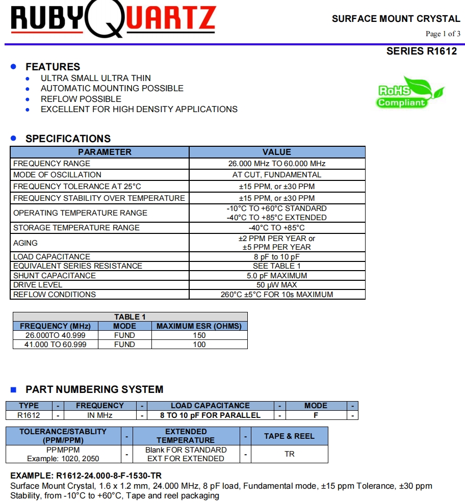 6G藍牙晶振,R1612-30.000-8-F-1530-TR,Rubyquartz盧柏晶體 參數表