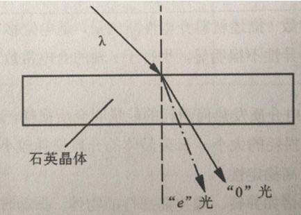 石英晶體也與其它一些物質(如方解石CaCO3、硝酸鈉NaNO3晶體等)那樣具有雙折射現象,即一束光射入石英晶振時,分裂成兩束沿不同方向傳拓的光其中一束光遵循折射定律,叫做尋常光或稱“0”光,另一束光不遵循折射定律,叫做非尋常光,又稱“e”光,如圖1.3.1所示,尋常光在石英晶體內部各個方向上的折射率mo是相等的,而非尋常光在石英晶體的內部各個方向的折射率n0卻是不相等的。例如:對于波長為5893A的光,石英晶體的n0=1.54425,最大的ne=1.5536。石英晶體雖然具有雙折射現象,但當光沿z軸方向入射時,不發生雙折射現象,所以又稱z軸為光軸