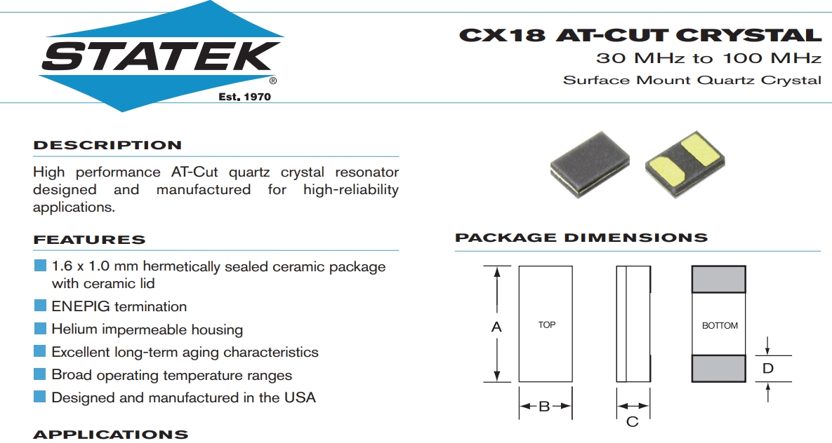 斯塔克陶瓷諧振器\航空航天6G晶振\CX18SCSM1-40.0M,20/10/-/I,6pF,尺寸1610mm,頻率40MHZ,美國Statek晶振,美國進口晶振,1610mm無源晶振,音叉晶體,水晶振動子,SMD晶體諧振器,1610mm貼片晶振,無源SMD晶振,兩腳貼片晶振,無源陶瓷晶振,無源晶振,陶瓷諧振器,無鉛環保晶振,低損耗晶振,低功耗晶振,高質量無源晶振,高精度晶振,航空航天專用晶振,軍事應用晶振,數據通信晶振,通訊設備晶振。