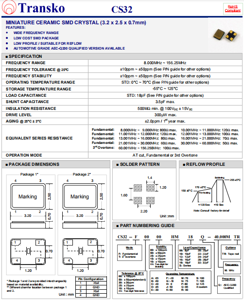 Transko晶振,CS32晶振,貼片無源晶體,貼片晶振本身體積小,超薄型石英晶體諧振器,特別適用于有目前高速發展的高端電子數碼產品,因為晶振本身小型化需求的市場領域,小型,薄型是對應陶瓷諧振器(偏差大)和普通的石英晶體諧振器(偏差小)的中間領域的一種性價比較出色的產品.產品廣泛用于筆記本電腦,無線電話,衛星導航HDD, SSD, USB, Blu-ray等用途,符合無鉛焊接的高溫回流焊曲線特性.