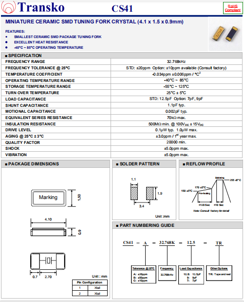 Transko晶振,CS41晶振,音叉晶體,貼片壓電石英晶體,體積小,焊接可采用自動貼片系統(tǒng),產(chǎn)品本身小型,表面貼片晶振,特別適用于有小型化要求的電子數(shù)碼產(chǎn)品市場領(lǐng)域,因產(chǎn)品小型,薄型優(yōu)勢,耐環(huán)境特性,包括耐高溫,耐沖擊性等,在移動通信領(lǐng)域得到了廣泛的應用,晶振產(chǎn)品本身可發(fā)揮優(yōu)良的電氣特性,滿足無鉛焊接的高溫回流溫度曲線要求.