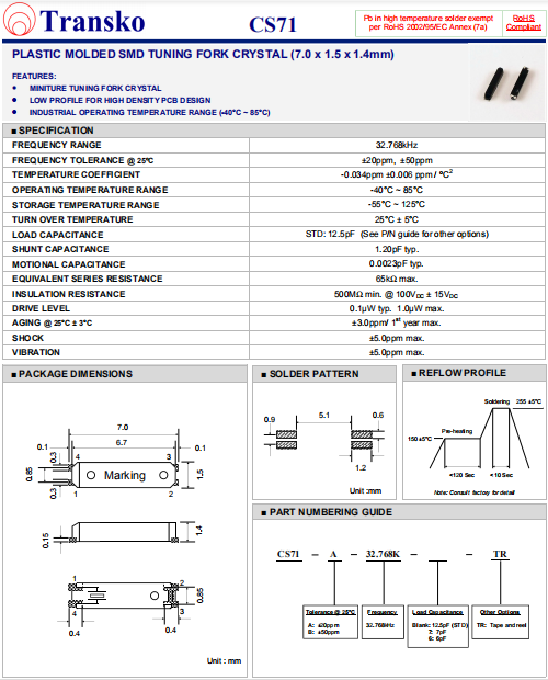Transko晶振,CS71晶振,音叉水晶振子,小型貼片石英晶振,外觀尺寸具有薄型表面貼片型石英晶體諧振器,特別適用于有小型化要求的市場領域,比如智能手機,無線藍牙,平板電腦等電子數碼產品.晶振本身超小型,薄型,重量輕,晶體具有優良的耐環境特性,如耐熱性,耐沖擊性,在辦公自動化,家電相關電器領域及Bluetooth,Wireless LAN等短距離無線通信領域可發揮優良的電氣特性,滿足無鉛焊接的回流溫度曲線要求.