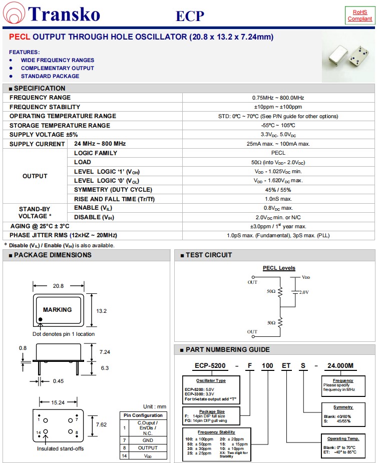 Transko有源晶振,ECP-5200-F20ETS-19.6608MHz,通孔振蕩器6G無線晶振,參數(shù)表
