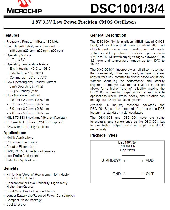The DSC1001/3/4 is a s ilicon MEMS based CMOS family of oscillators that offers excellent jitter and stability performance over a wide range of supply voltages and temperatures. The device operates from 1 MHz to 150 MHz with supply voltages between 1.8 to 3.3 volts and temperature ranges up to –40°C to 105°C.