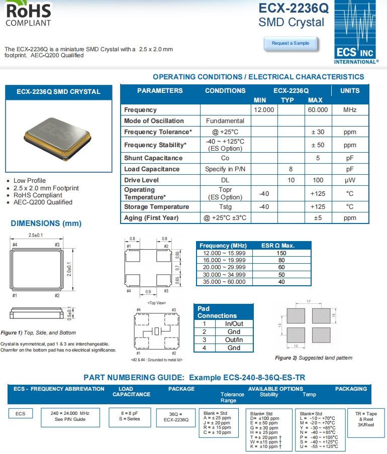 | ECS-120-10-36Q-ES-TR | ECS晶振 | ECX-2236Q | 12MHz | -40°C ~ 125°C |
