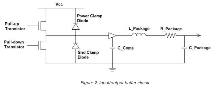 該模型使用電源和接地箝位來確保電壓保持在可接受的范圍內, 相對于振蕩器Vdd和地。這也意味著等效電路可以表示為 封裝電阻、電感和電容。為每個焊盤保存行為信息,以 確定它將如何與電路的其余部分相互作用。這包括電流與電壓的關系 如上拉、下拉、電源箝位和接地箝位信息,以及電壓與時間數據,如 上升和下降波形。