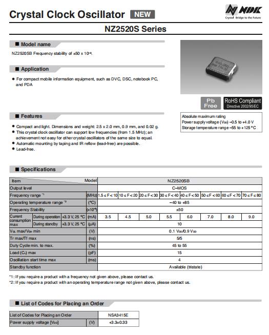 | NZ2520SA-2.750000MHZ | NDK振蕩器 | NZ2520SA | 2.75MHz | 3V |