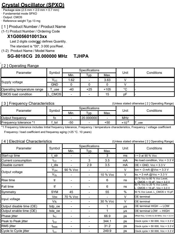 | X1G005601001300 | SG-8018CG | 20.000000 MHz | 2.50 x 2.00 x 0.80 mm | CMOS | 1.620 to 3.630 V | -40 to 105 °C | +/-50 ppm | ≤ 3.5 mA |